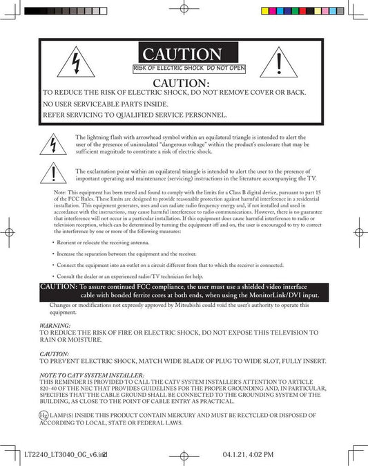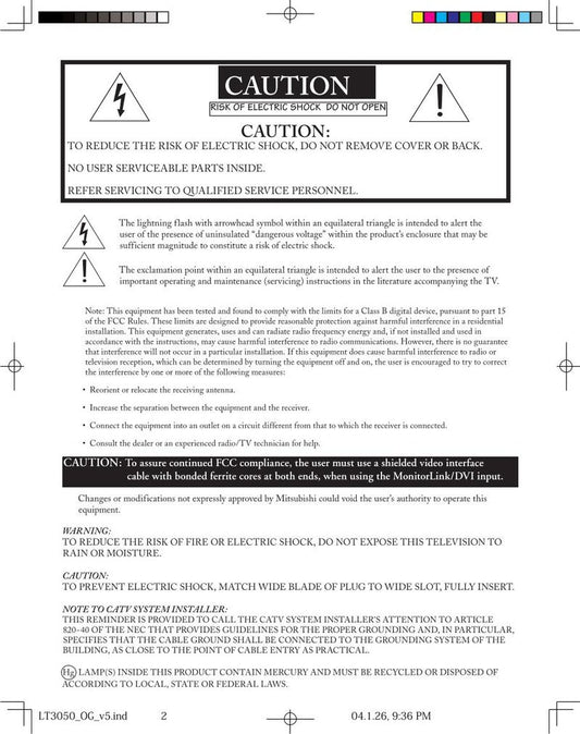 Mitsubishi LT40164 LT46164 LT55154 TV Operating Manual