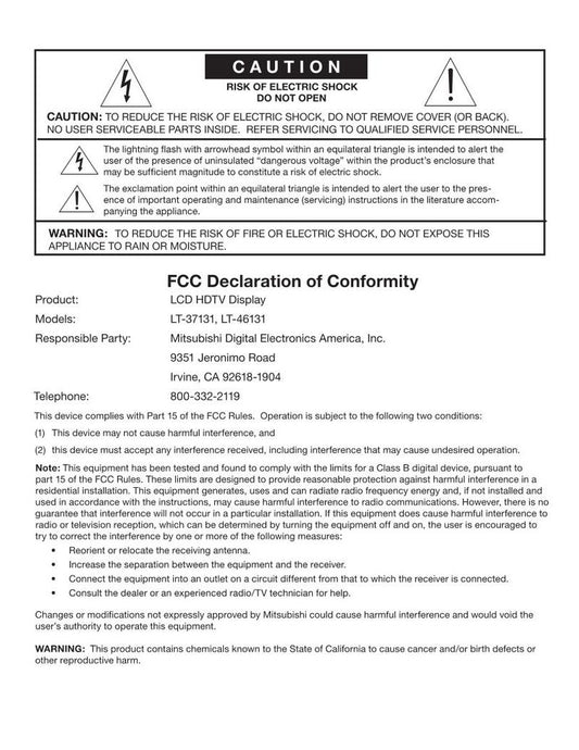 Mitsubishi LT37131 LT46131 TV Operating Manual