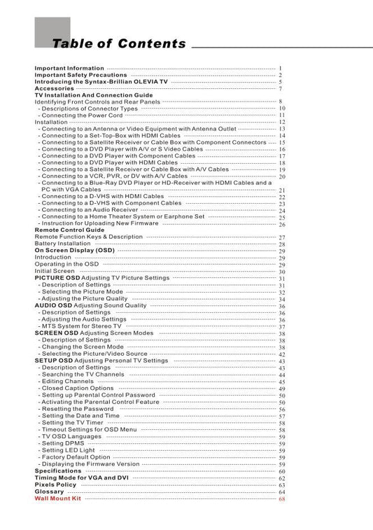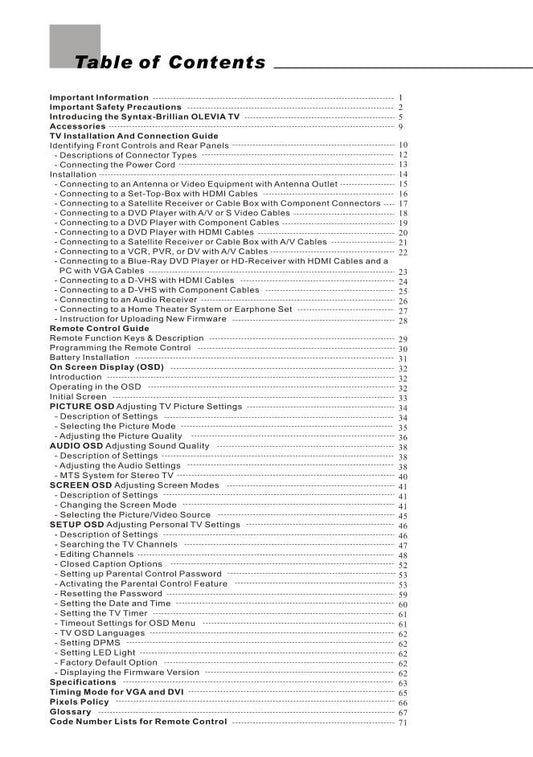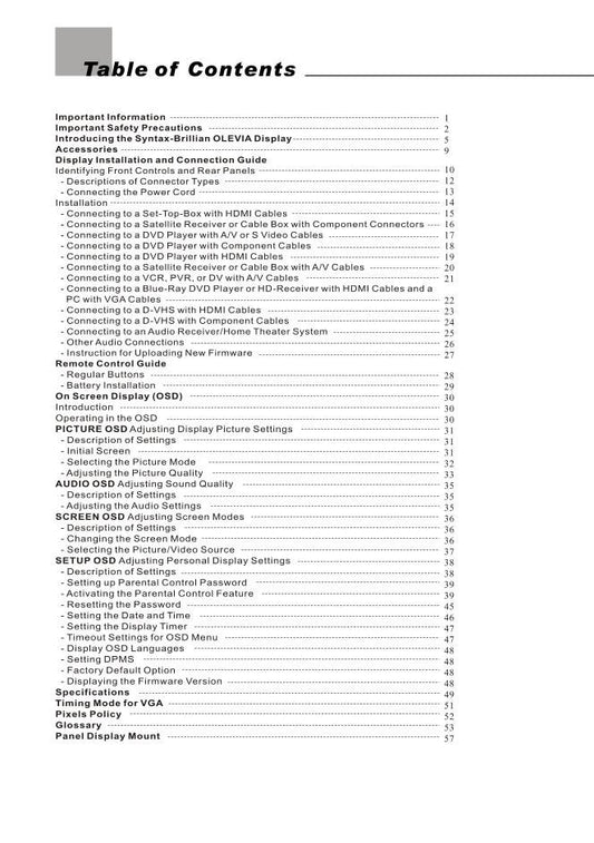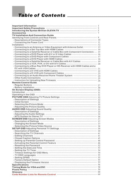 Discover Olevia TV service and operating manuals, available as downloadable PDFs and binded copies. Our comprehensive guides provide detailed setup instructions, troubleshooting tips, and maintenance advice to ensure your Olevia TV performs at its best. Browse our collection today to find the perfect manual for your model.