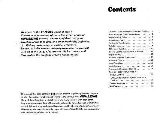 Yamaha D-85 Electone Organ Owner's/ User Manual (Pages: 36)