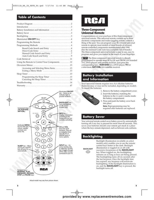 RCA RCR311 Series Operating Manual with Codes Universal Remote Control Operating Manual
