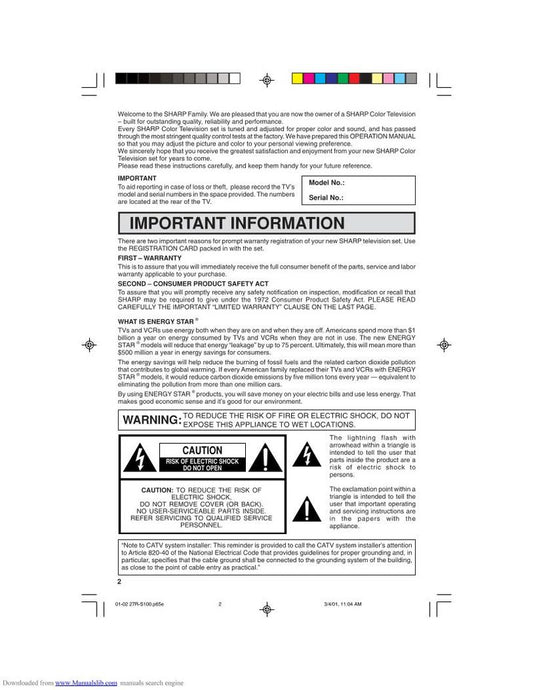 Sharp 32C230 32C231 36C230 Consumer Electronics Operating Manual