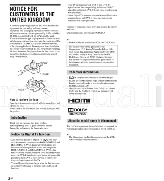 Sony KDL-40P3600 KDL-40P5650 KDL-40S5650 KDL-37P3600 KDL-37P5650 (37 pages) TV Operating Manual