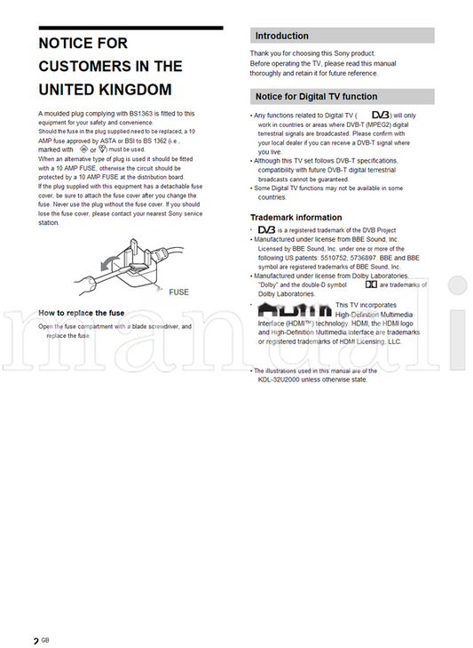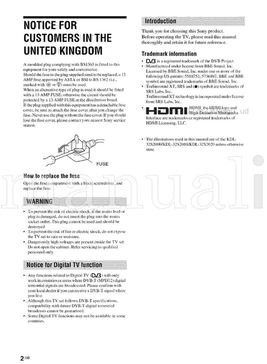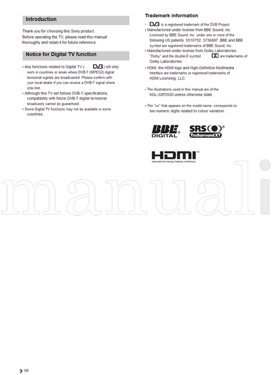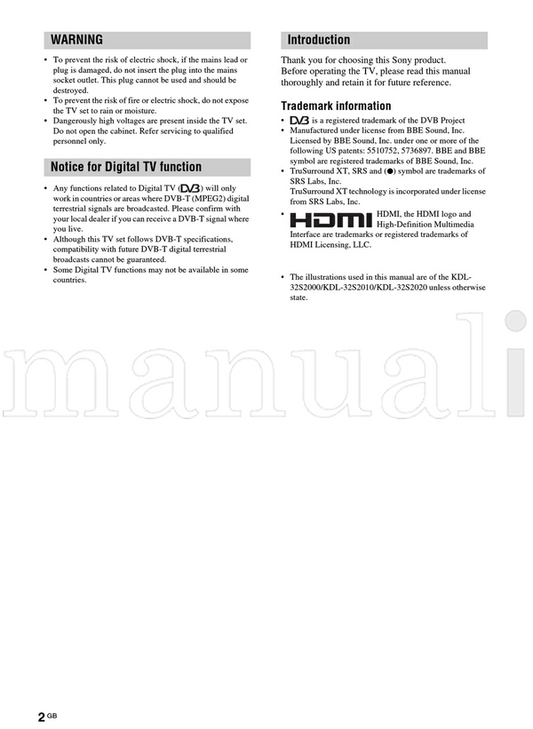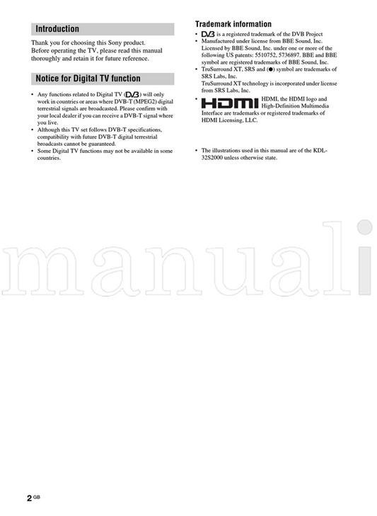 Sony KDL-46S2000 KDL-46S2010 KDL-40S2000 KDL-40S2010 KDL-32S2000 (132 pages) TV Operating Manual