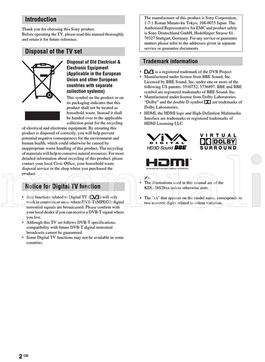 Sony KDL-26T30xx (204 pages) TV Operating Manual