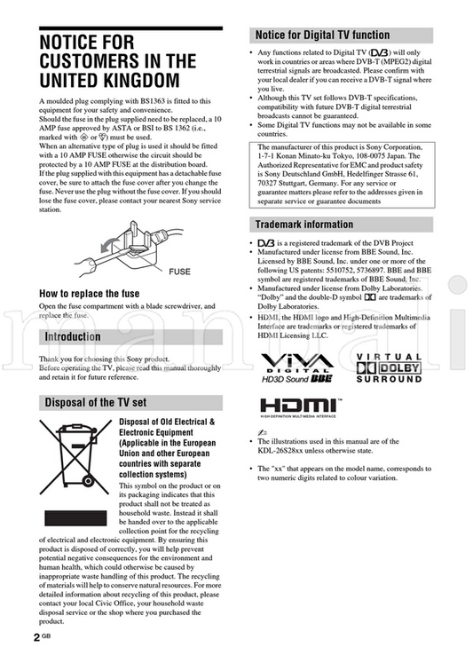 Sony KDL-40U2000 KDL-32U2000 KDL-26U2000 (27 pages) TV Operating Manual