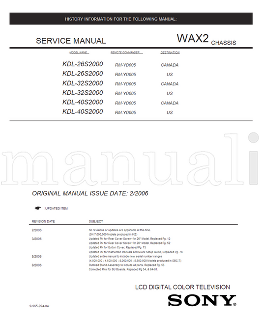 Sony KDL-26S2000 KDL-32S2000 KDL-40S2000 9-965-994-01 RM-YD005 (80 pages) TV Service Manual