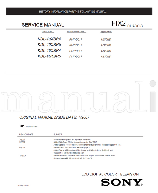 Sony KDL-40XBR4 KDL-40XBR5 KDL-46XBR4 KDL-46XBR5 9-883-758-04 (152 pages) TV Service Manual