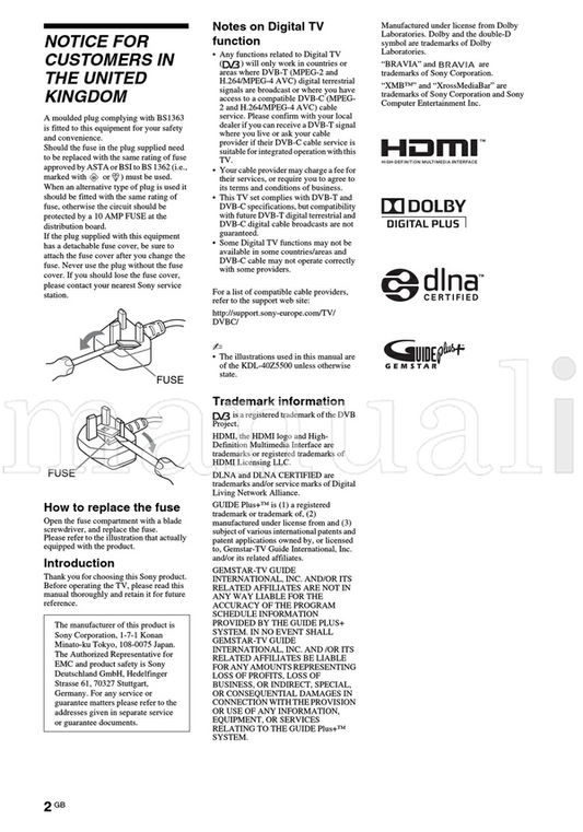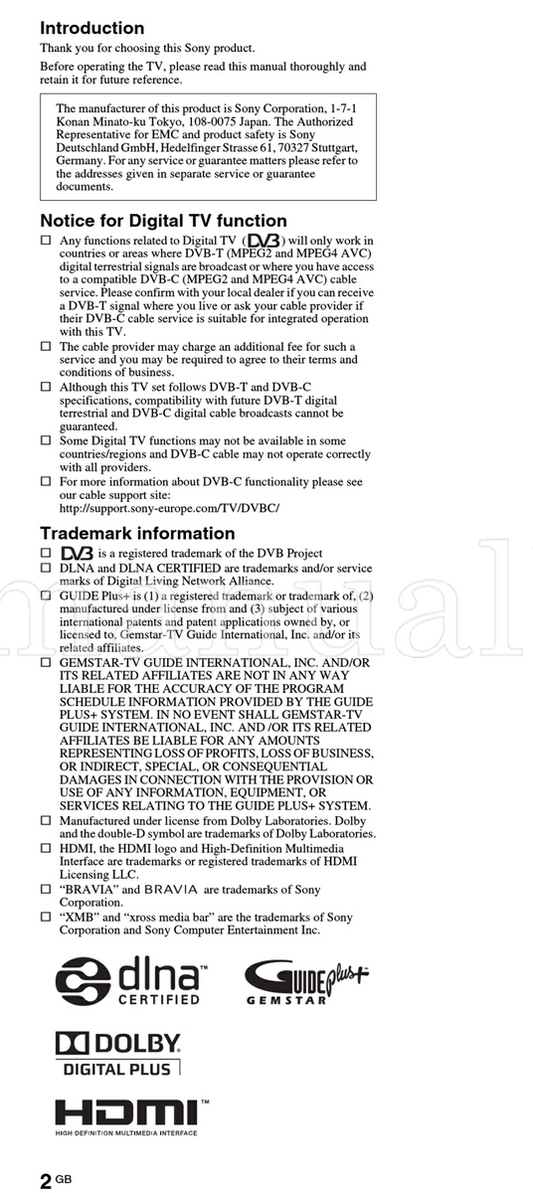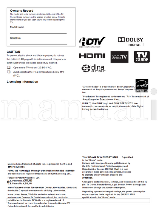 Sony KDL-52Z5100 KDL-46Z5100 KDL-40Z5100 (48 pages) TV Operating Manual