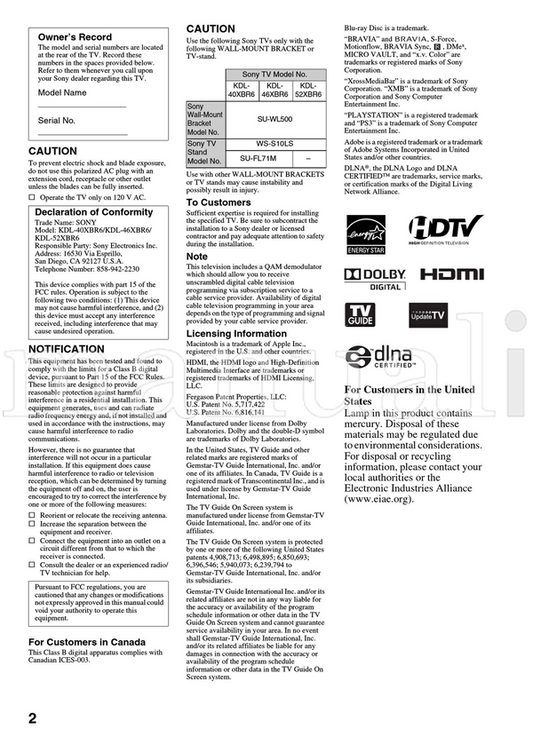 Sony 1-800-222-SONY 1-877-899-SONY KDL-40XBR7 KDL-70XBR7 (63 pages) TV Operating Manual