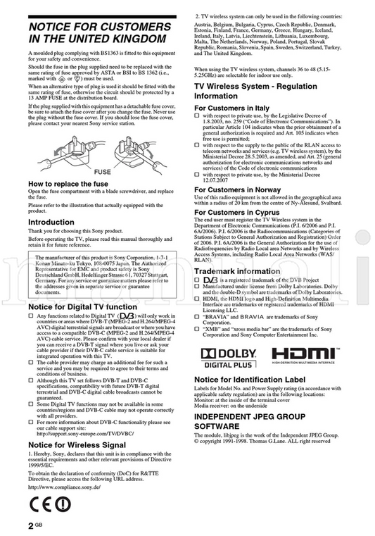 Sony 1-800-222 1-877-899 KDL-40XBR7 KDL-70XBR7 KDL-46XBR8 (61 pages) TV Operating Manual