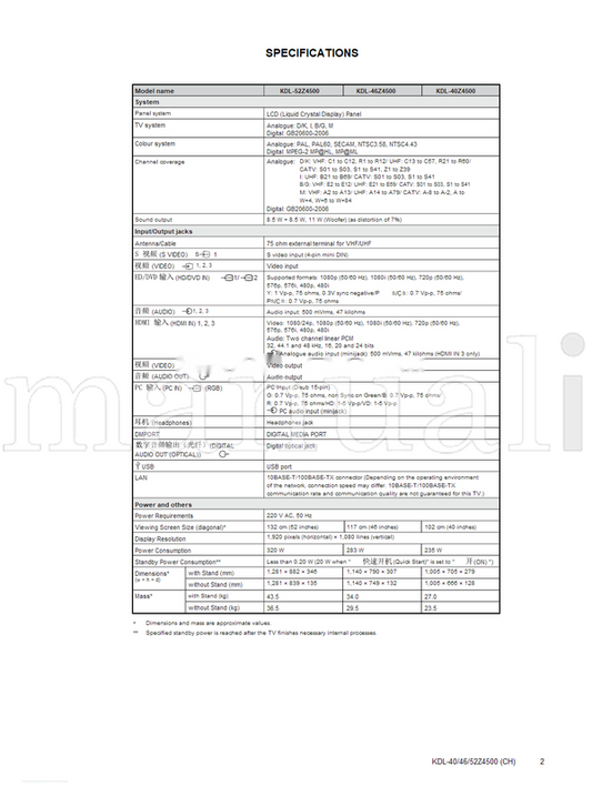 Sony KDL-52Z4500 KDL-46Z4500 KDL-40Z4500 (195 pages) TV Operating Manual