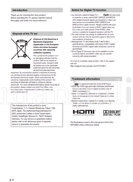 Sony KDL-40W3000 KDL-46W3000 KDL-52W3000 (56 pages) TV Operating Manual