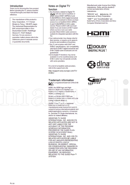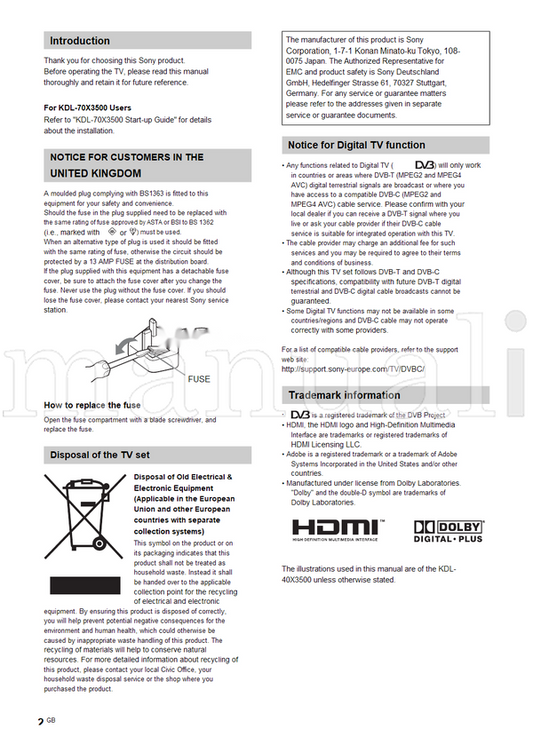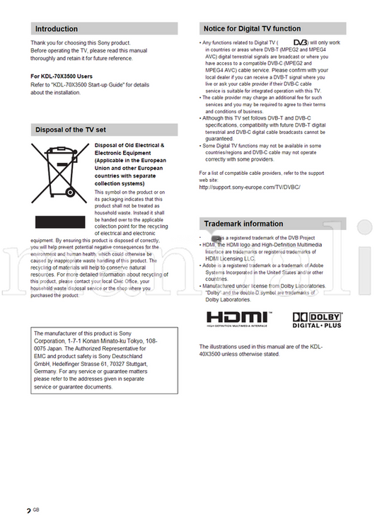 Sony KDL-70X3500 KDL-52X3500 KDL-46X3500 KDL-46X3000 KDL-40X3500 (164 pages) TV Operating Manual