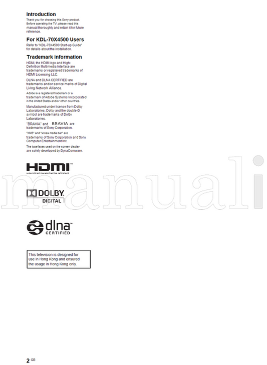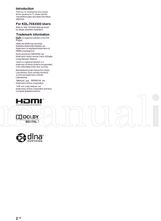 Sony KDL-70X4500 KDL-55X4500 KDL-46X4500 KDL-40X4500 (108 pages) TV Operating Manual