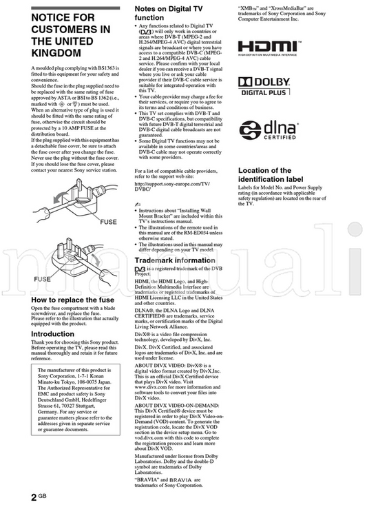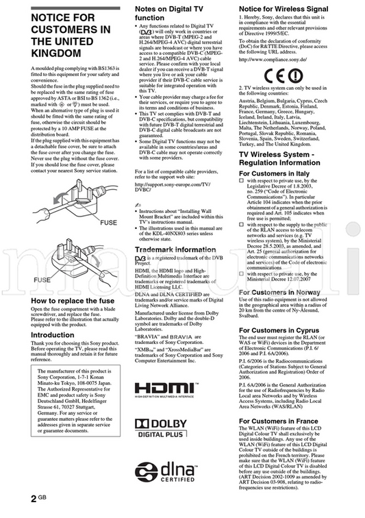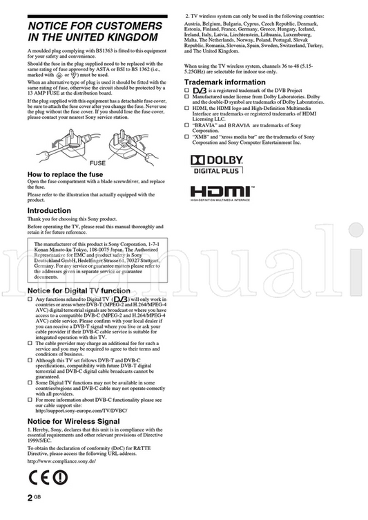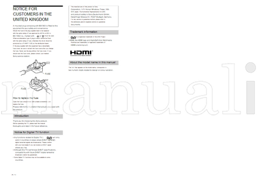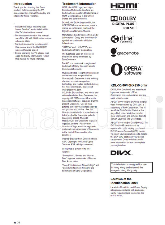 Sony KDL-65HX950 55HX950 55HX850 46HX850 40HX850 (60 pages) TV Operating Manual