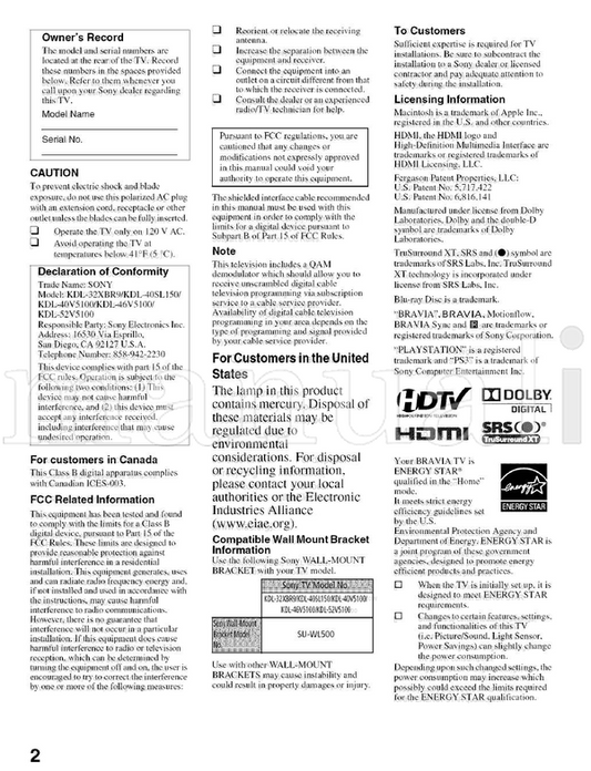Sony KDD52V5100 KDD46V5100 KDD40V5100 KDD40SL150 KDD32XBR9 (24 pages) TV Operating Manual