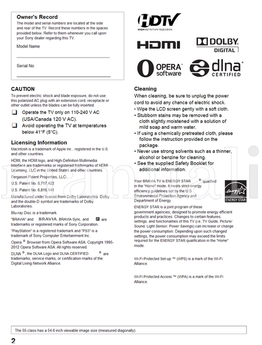Sony KDL-52HX903 46HX903 46HX803 40HX803 4-180-175 (20 pages) TV Operating Manual