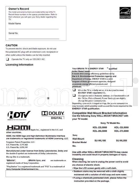 Sony KDL-37L5000 KDL-32L5000 KDL-26L5000 KDL-22L5000 (48 pages) TV Operating Manual