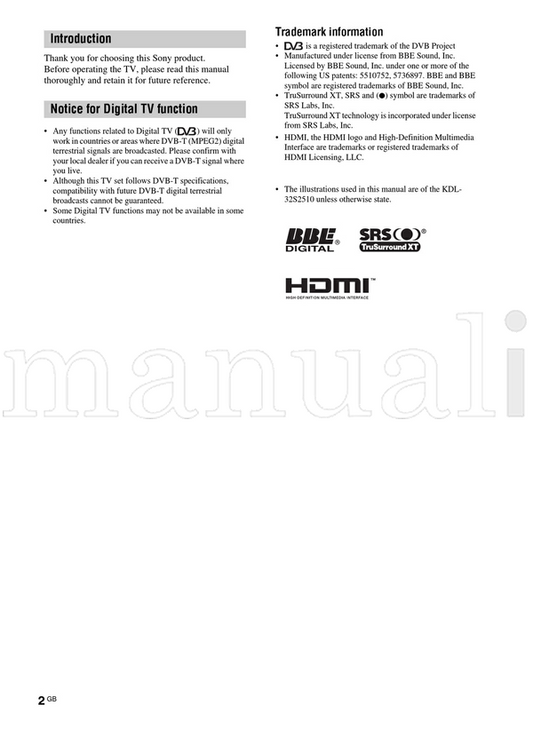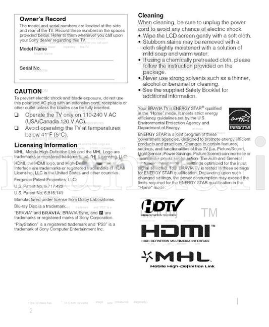 Sony KDL-46S2510 KDL-46S2530 KDL-40S2510 KDL-40S2530 KDL-32S2510 (42 pages) TV Operating Manual