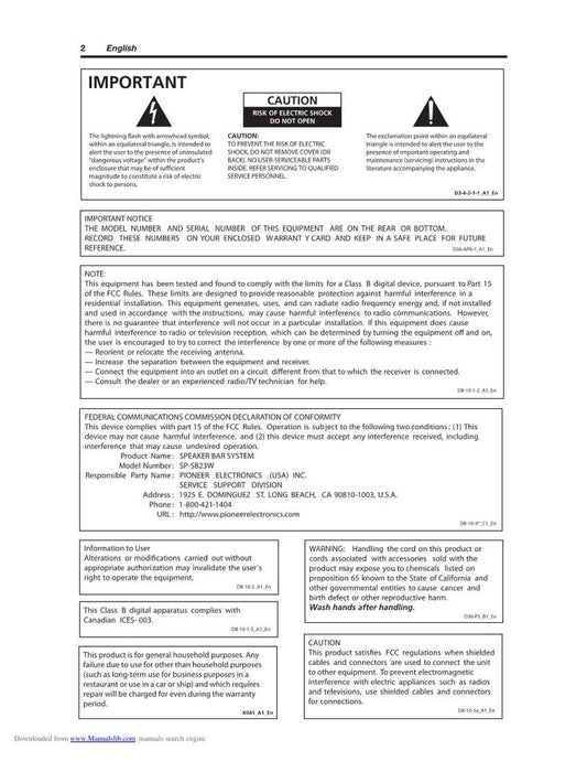 Pioneer SP-SB23 Sound Bar System Operating Manual