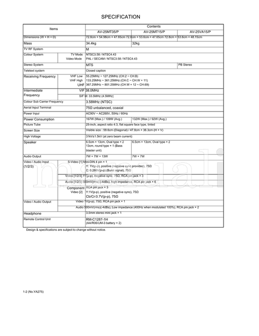 JVC YA275 AV-25MT35 AV-25VA15 RM-C1287 AV-25MT15 (66 pages) TV Service Manual