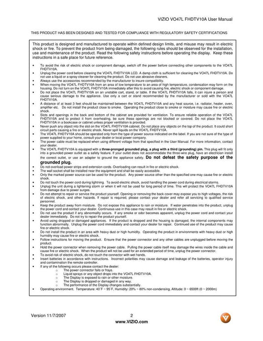 Vizio VO37L TV Operating Manual