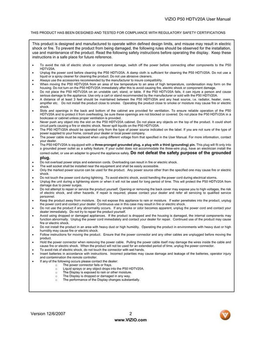 Vizio P50HDM TV Operating Manual