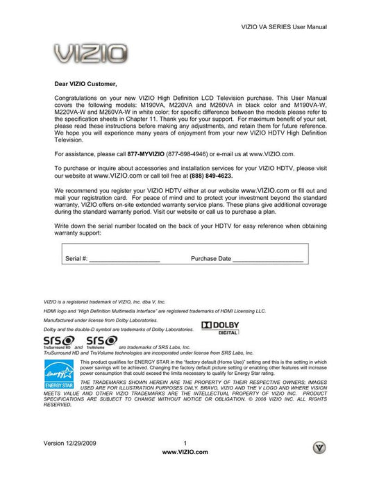 Vizio M190VA M220VA M260VA TV Operating Manual