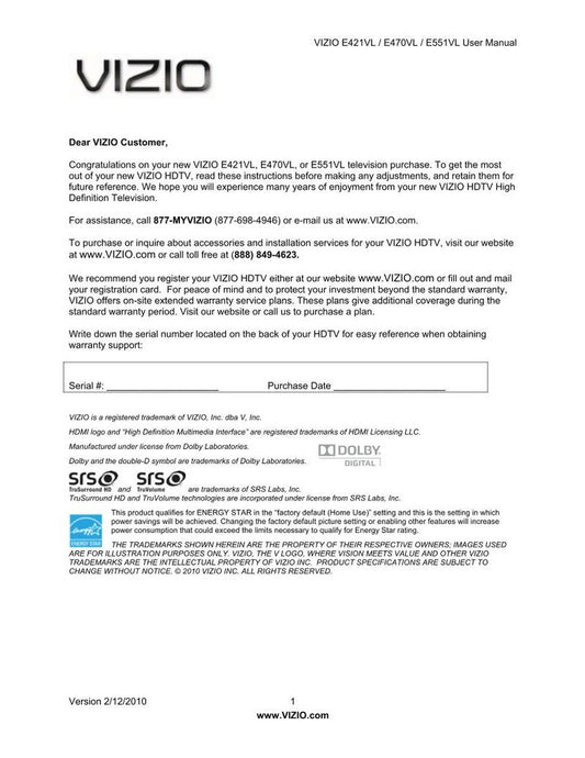Vizio E421VL E470VL E551VL TV Operating Manual