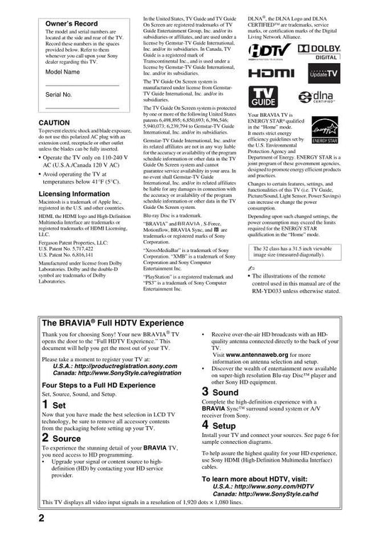 Sony KDL32EX700 KDL32EX710 KDL40EX700 TV Operating Manual