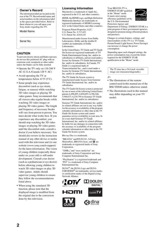 Sony KDL46HX800 KDL55HX800 KDLXBR40HX800 TV Operating Manual