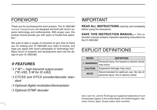 Icom IC-V82 & IC-U82 VHF/UHF Transceiver Owner/ User Manual (Pages: 96)