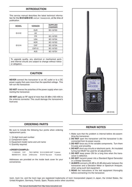 Icom ID-51 A & E VHF/UHF Transceiver Service Manual (Pages: 60)