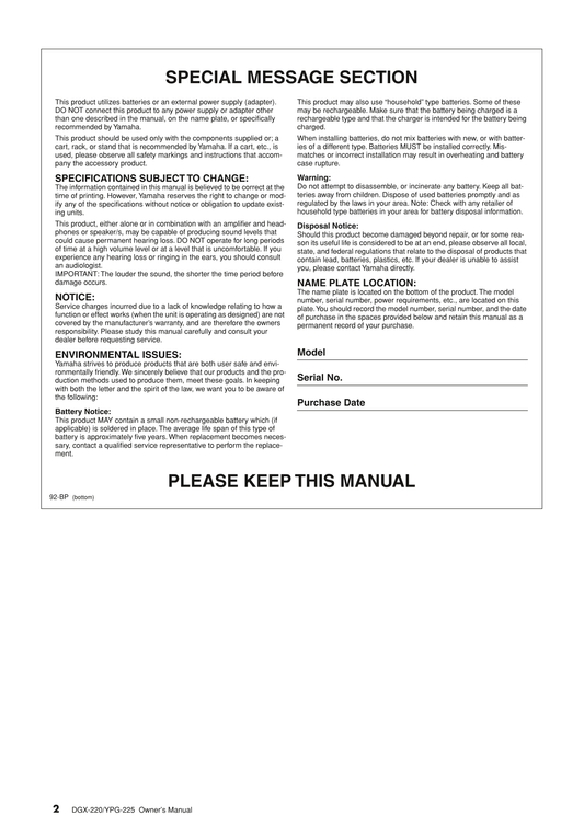 Yamaha DGX-220 & YPG-225 Portable Grand Piano Owner's/ User Manual (Pages:118)
