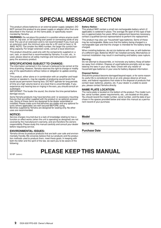 Yamaha DGX-630 & YPG-635 Portable Grand Piano Owner's/ User Manual (Pages:154)