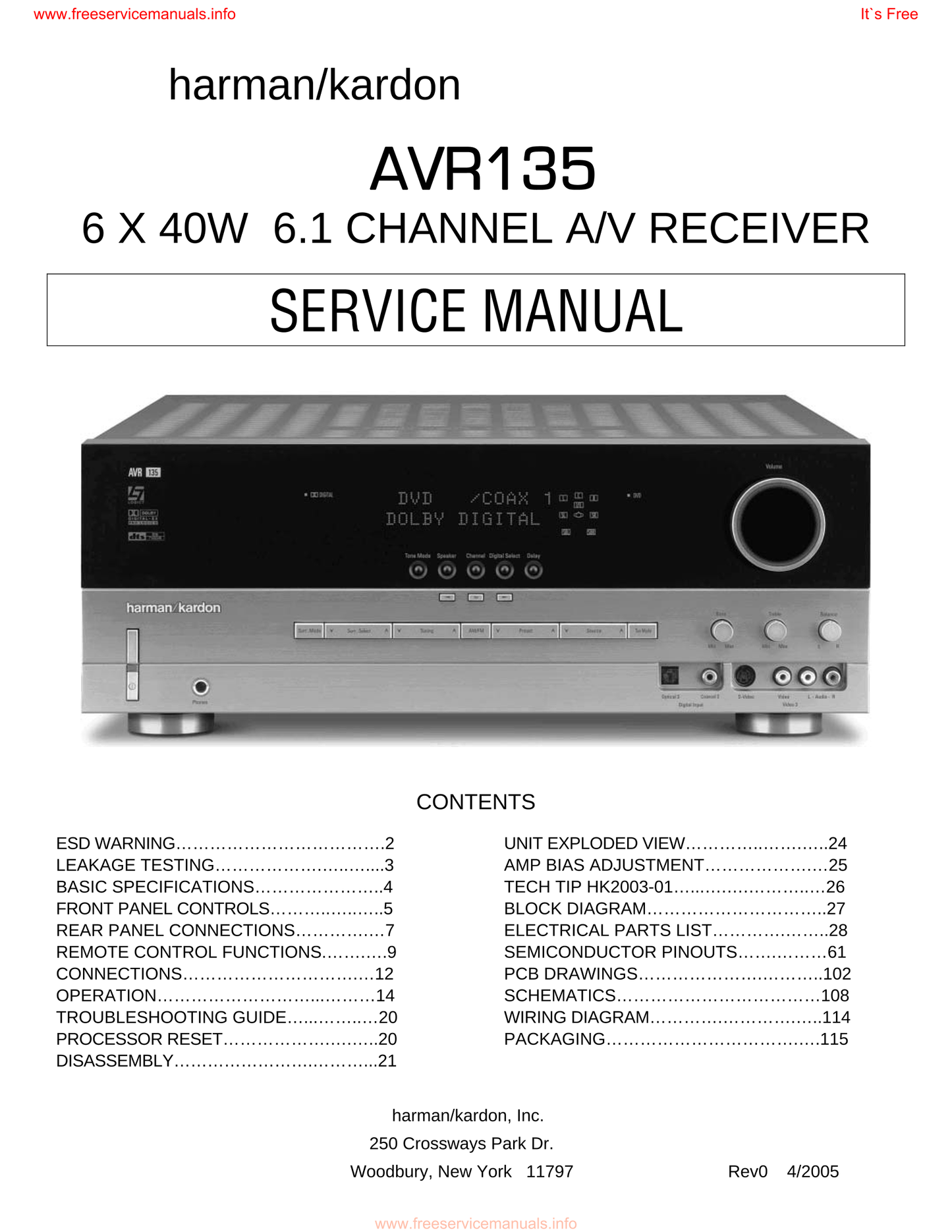 Looking for the Harman/ Kardon AVR135 AV Receiver Service Manual (Pages: 115) guide? Find it here. This manual includes nan pages of detailed information. Choose to download it or get a professionally printed copy from Manuali.