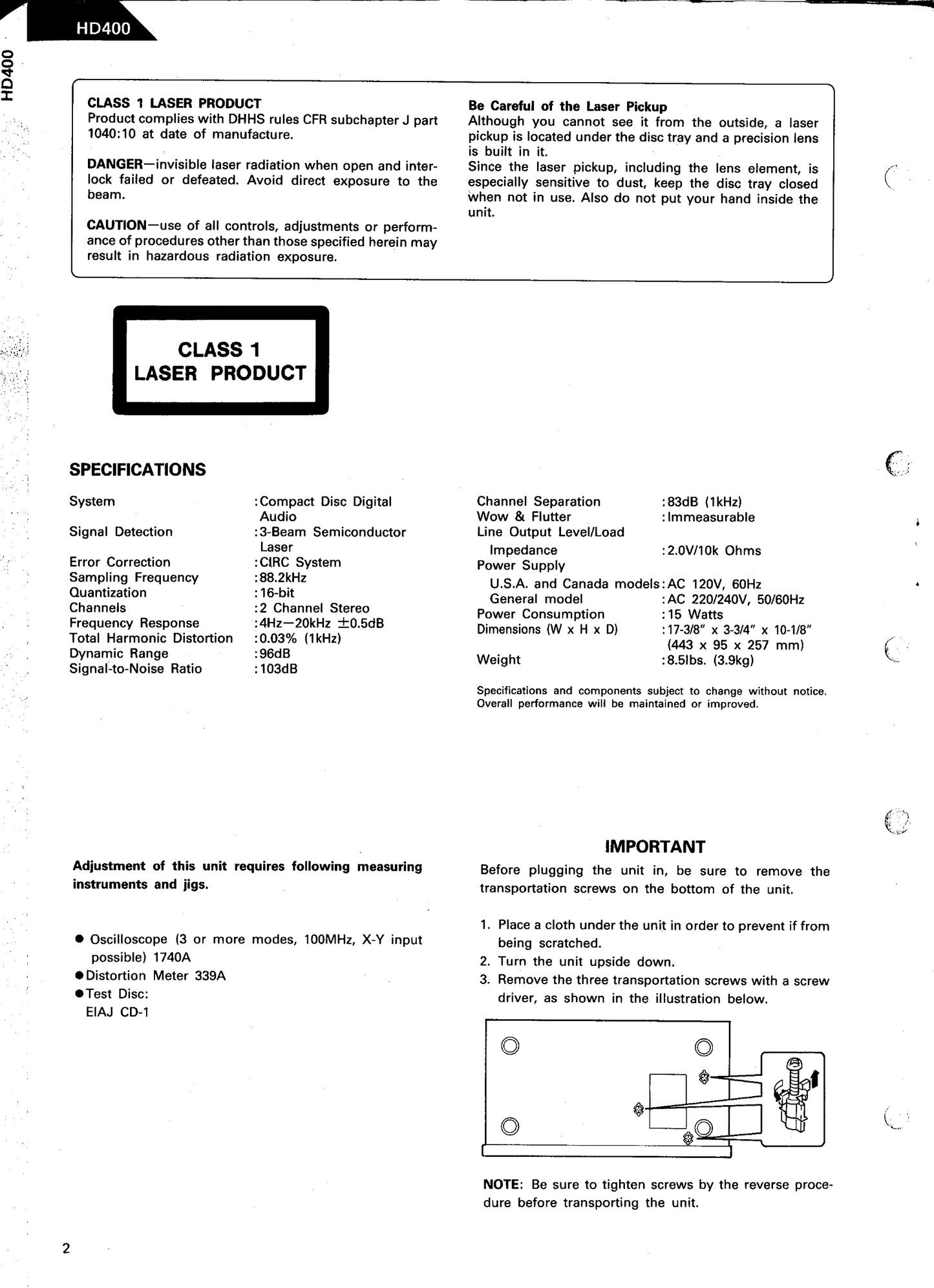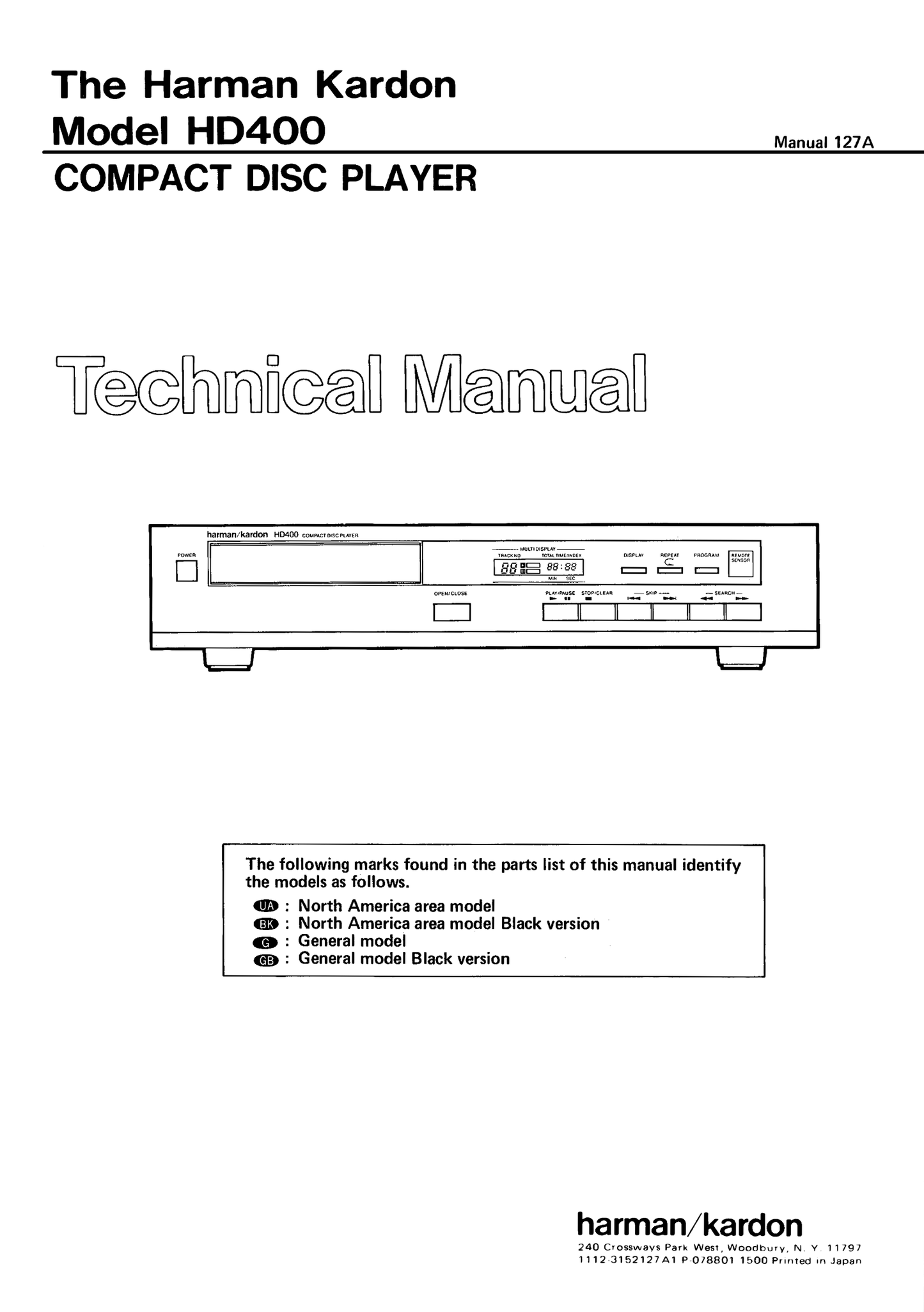 Harman/ Kardon HD400 CD Player Owner & Service Manual (Pages: 71)