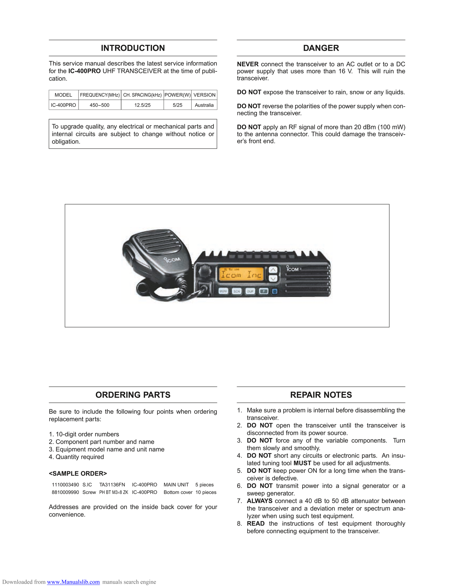 Explore the complete Icom IC-400 PRO UHF Transceiver Service Manual (Pages: 36) manual by Icom. This manual includes 36 pages of detailed information. Choose to download it or get a professionally printed copy from Manuali.