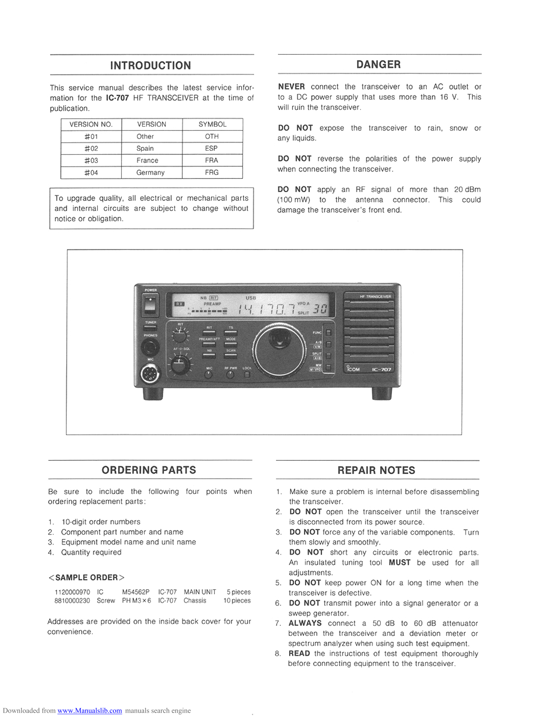 Download or print the Service Manual manual for Icom IC-707 HF Transceiver Service Manual (Pages: 72) today. This manual includes 72 pages of detailed information. Choose to download it or get a professionally printed copy from Manuali.