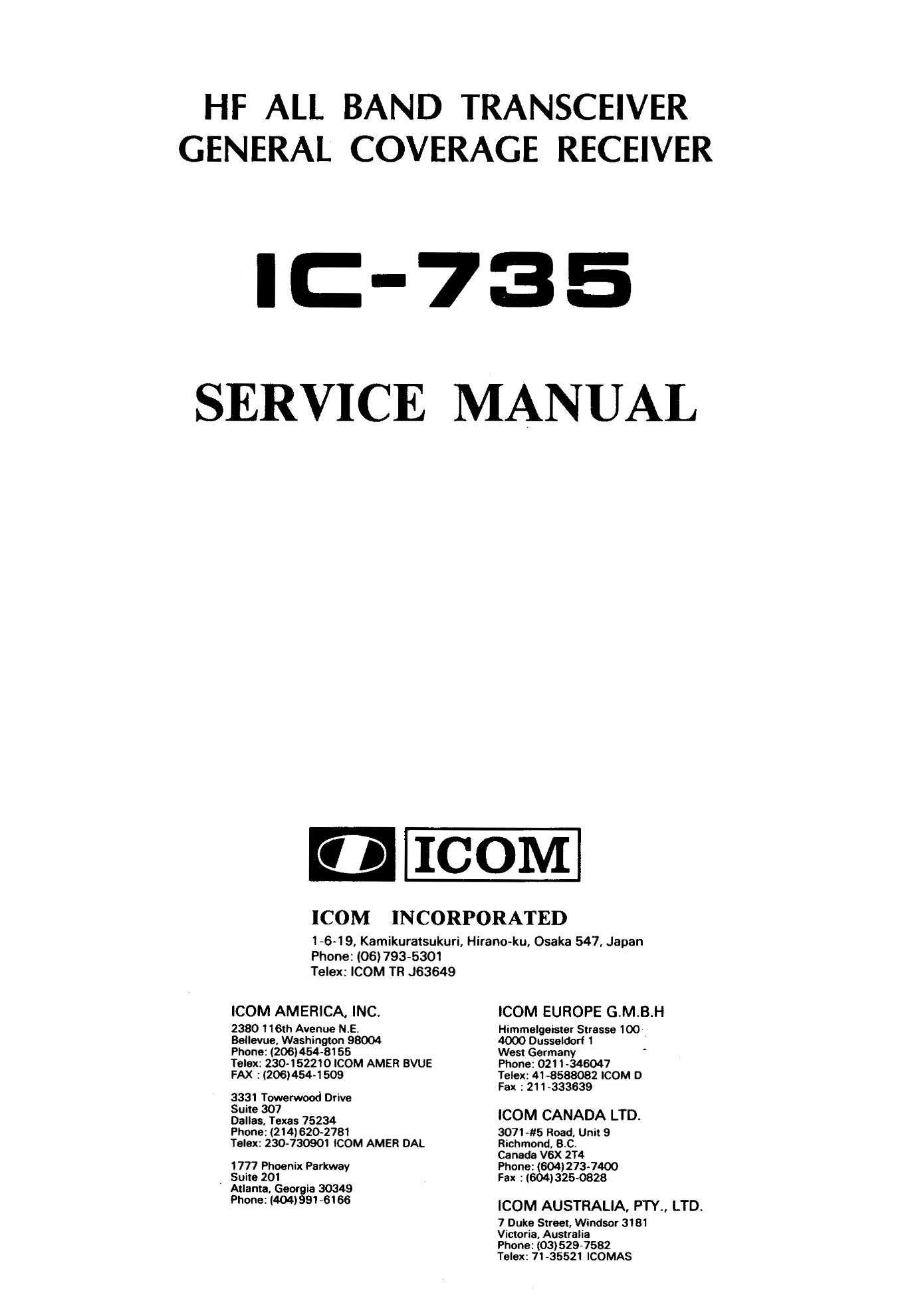 Your Icom IC-735 HF Transceiver Service Manual (Pages: 149) manual is available now for immediate download. This manual includes 149 pages of detailed information. Choose to download it or get a professionally printed copy from Manuali.