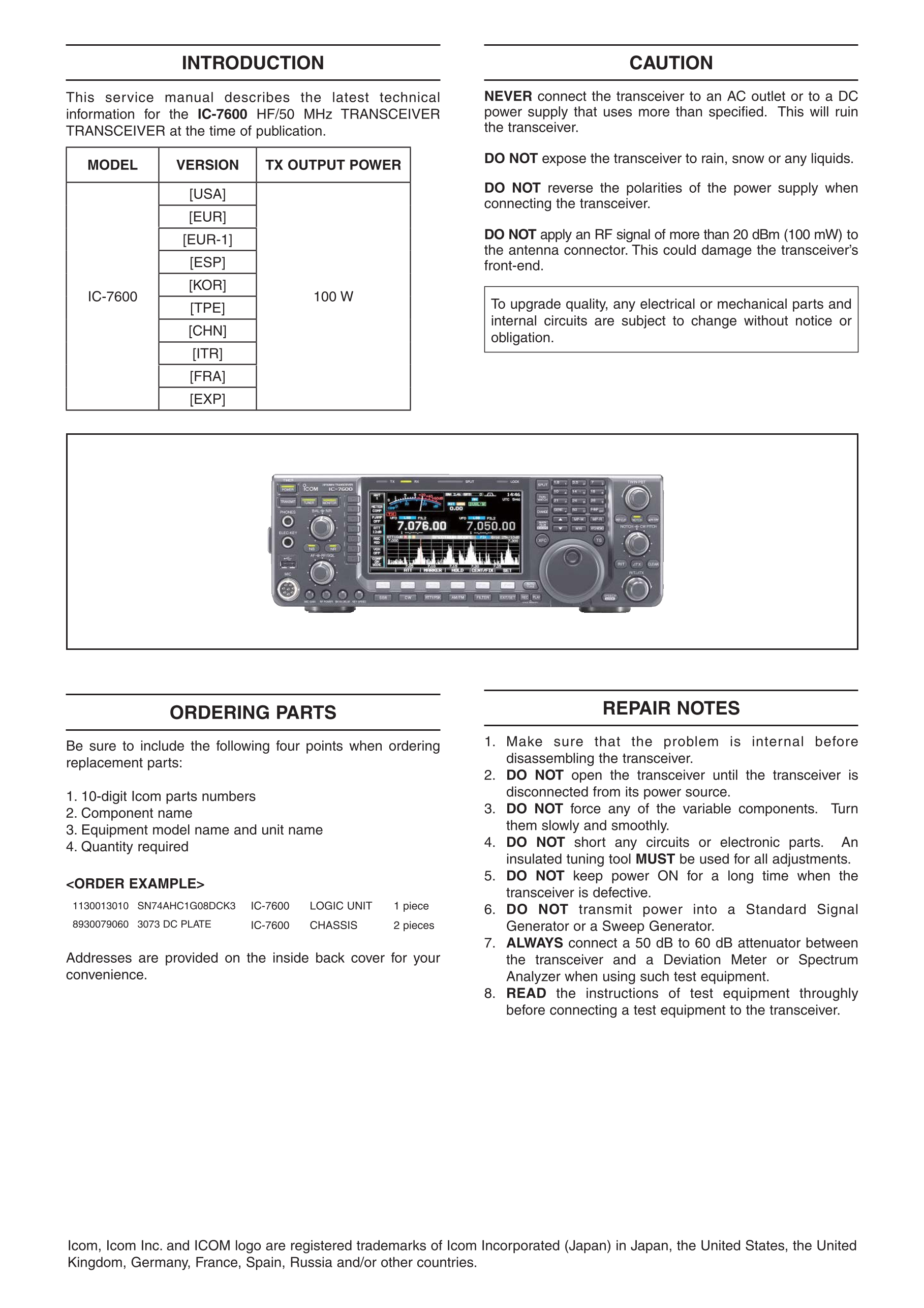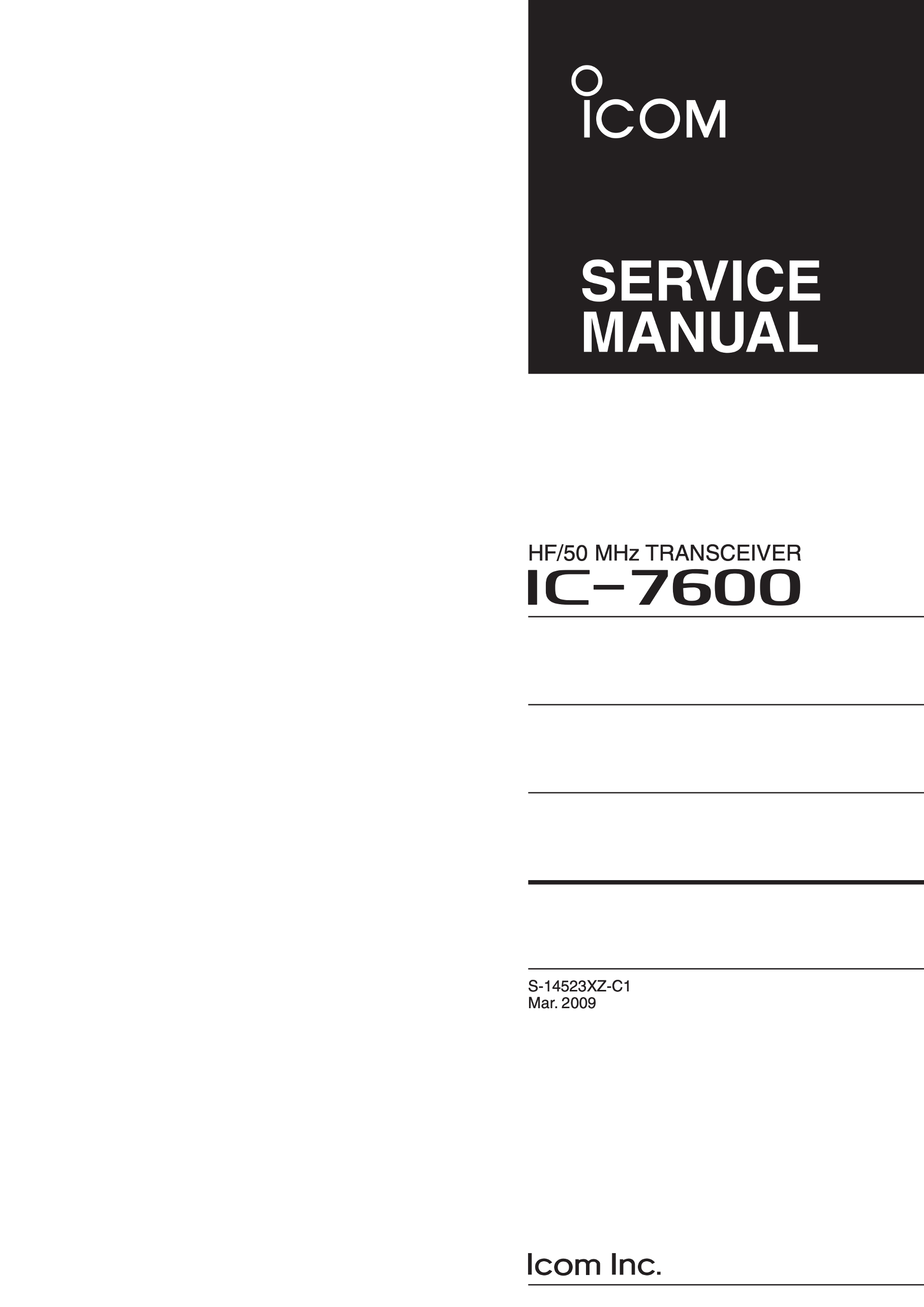 Download or print the Service Manual manual for Icom IC-7600 HF Transceiver Service Manual (Pages: 183) today. This manual includes 183 pages of detailed information. Choose to download it or get a professionally printed copy from Manuali.