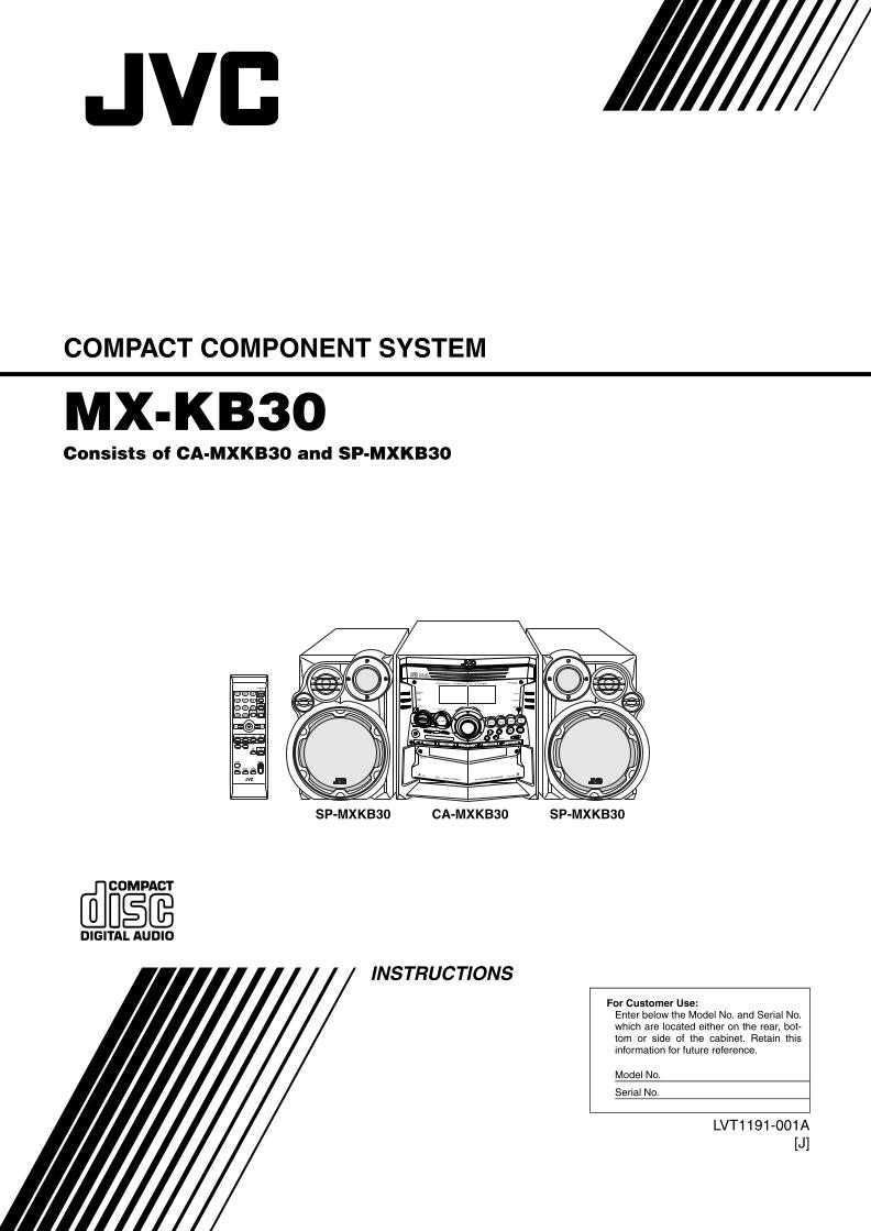JVC COMPACT COMPONENT SYSTEM INSTRUCTIONS MANUALINCLUDES:- Safty Precautions- Getting Started- Remote Control- Basic Operations- Advanced Operations- Timers- Troubleshooting- Specifications- Etc... Originally supplied with models: CAMXKB30, MXKB30, MXKB30J, SPMXKB30