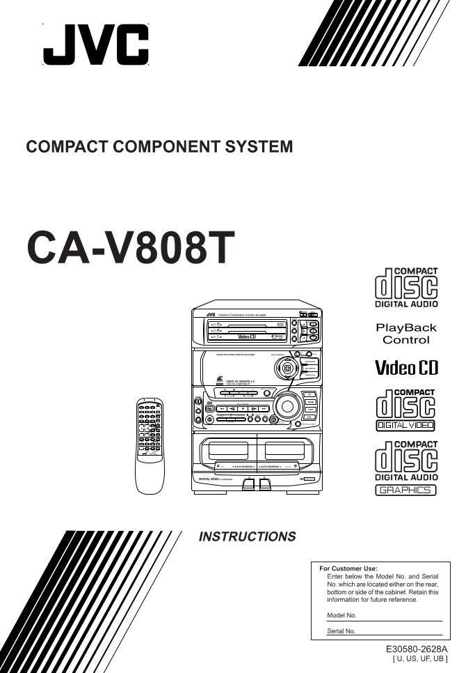 JVC COMPACT COMPONENT SYSTEM INSTRUCTION MANUAL Includes:- Safty Precautions- Connections- Remote Control (RMSEV808TU)- Basic Operations- Advanced Operations- Troubleshooting- Specifications- Etc Originally supplied with models: CAV808T