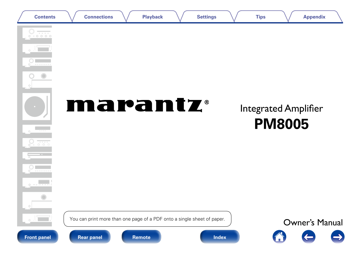 Get your hands on the Marantz Marantz PM8005 Amplifier Owner/ User Manual (Pages: 14), the perfect Operating Manual for any repair or operation. Available at Manuali with both printed and digital versions. Enjoy our professional printing service for a quality manual tailored to your needs. With 14.0 pages, this manual covers all the essential information.