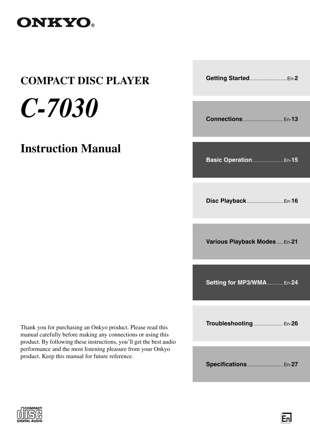 Access the comprehensive guide for the Onkyo C-7030 CD Player Owner's/ User Manual (Pages: 28) manual from Onkyo. This Operating Manual manual is available in both digital download and printed formats from Manuali, your trusted source for professional printing services. This manual contains 28 pages.