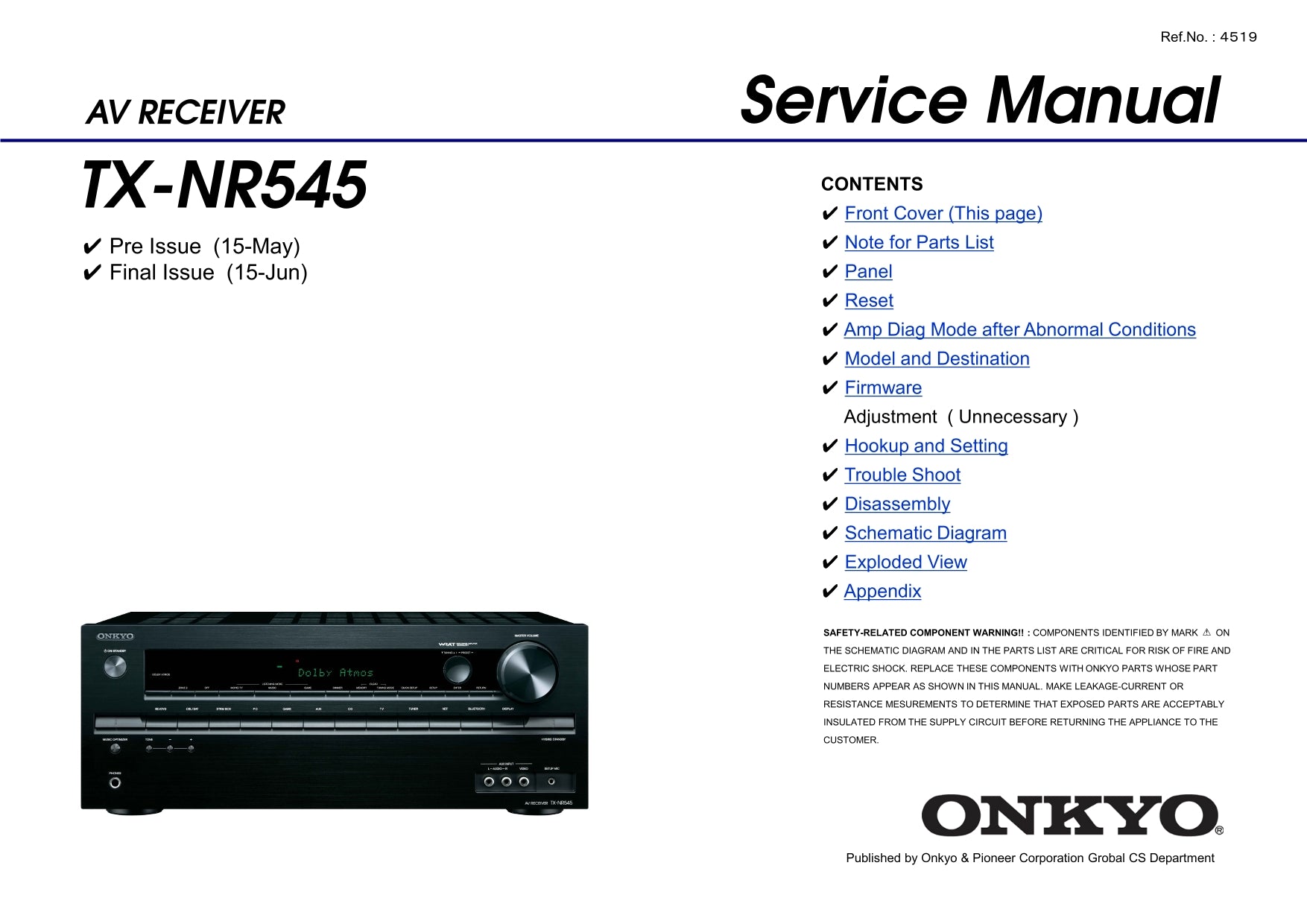 Access everything you need for the Onkyo TX-NR545 AV Receiver Service Manual (Pages: 131) with this comprehensive manual. This manual includes nan pages of detailed information. Choose to download it or get a professionally printed copy from Manuali.