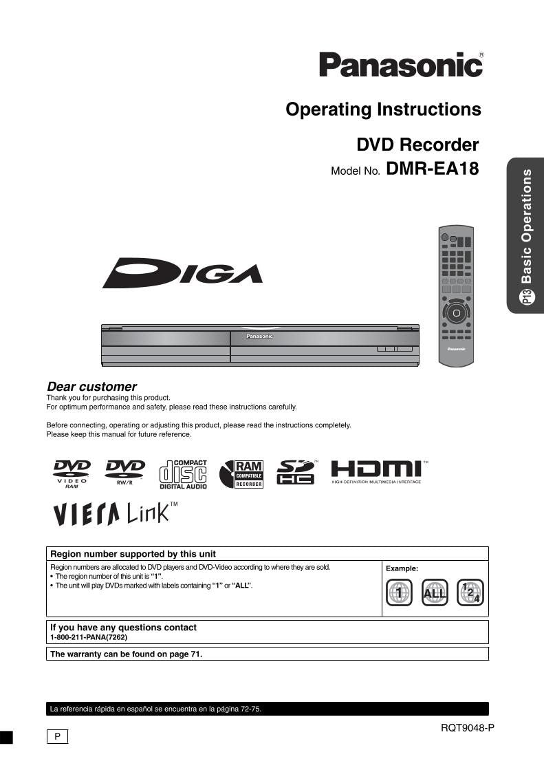 Panasonic DMREA18 DVD Recorder (DVDR) Operating Manual