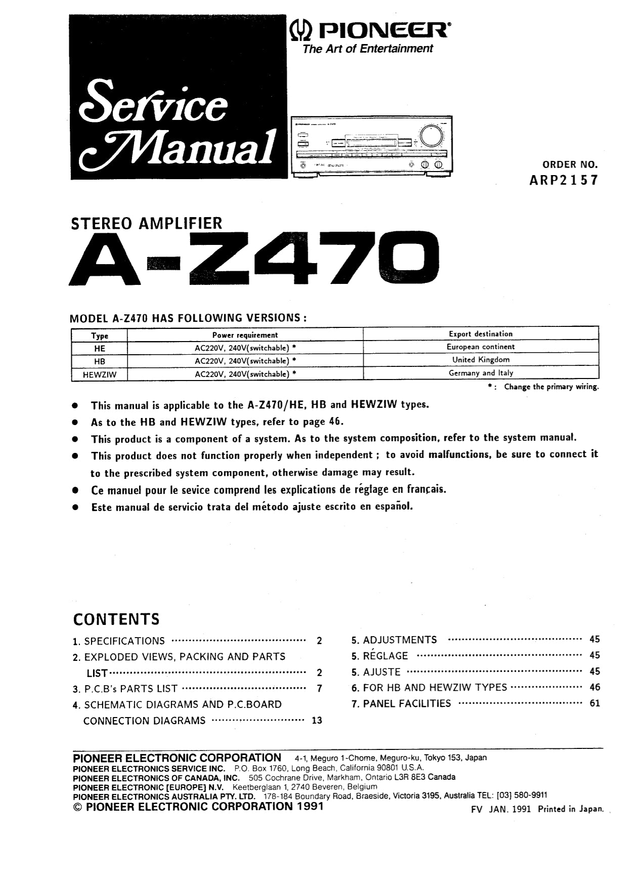 Check out the Pioneer A-Z470 Stereo Amplifier Service Manual (Pages: 42) manual from Pioneer. This Service Manual manual is available in both digital download and printed formats from Manuali, your trusted source for professional printing services. This manual contains 42 pages.