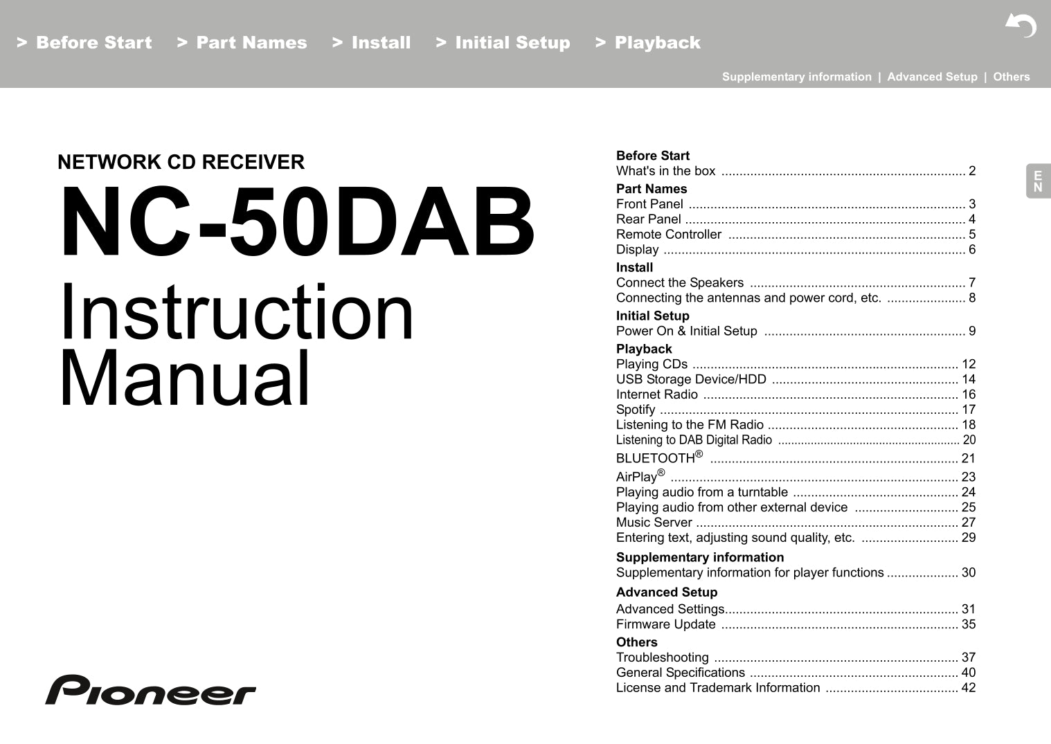 Your Pioneer NC-50 DAB Network CD Receiver Owner/ User Manual (Pages: 43) manual is available now for immediate download. This manual includes nan pages of detailed information. Choose to download it or get a professionally printed copy from Manuali.